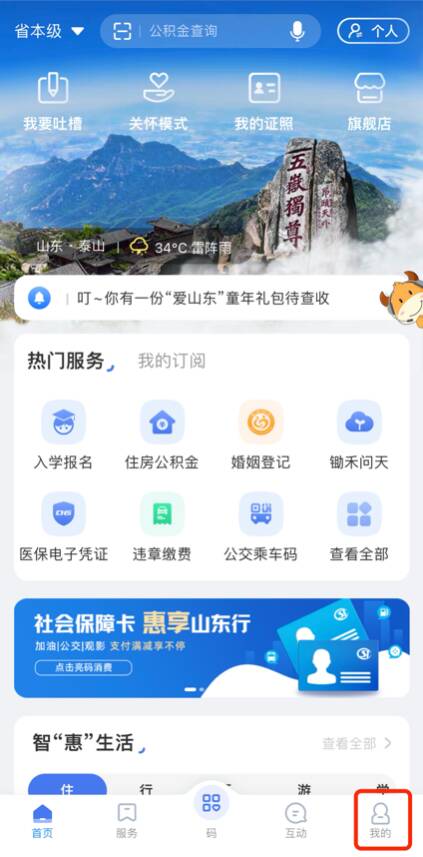 1、打开“爱山东”APP、微信或支付宝小程序,点击首页右下角“我的”;